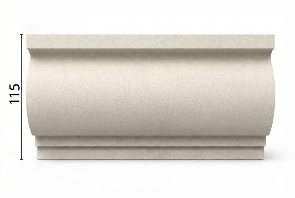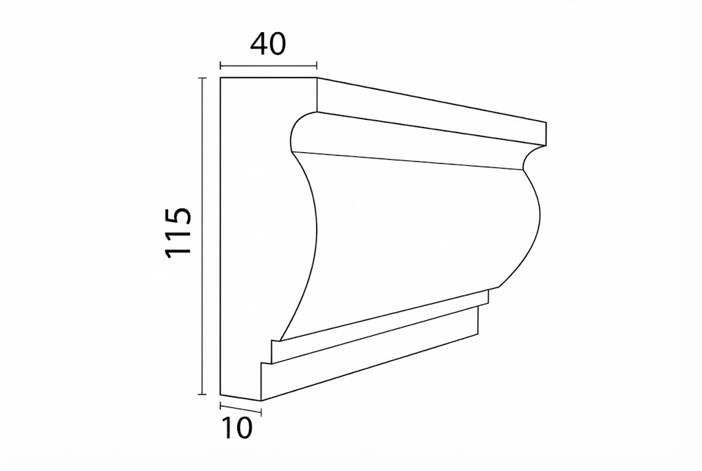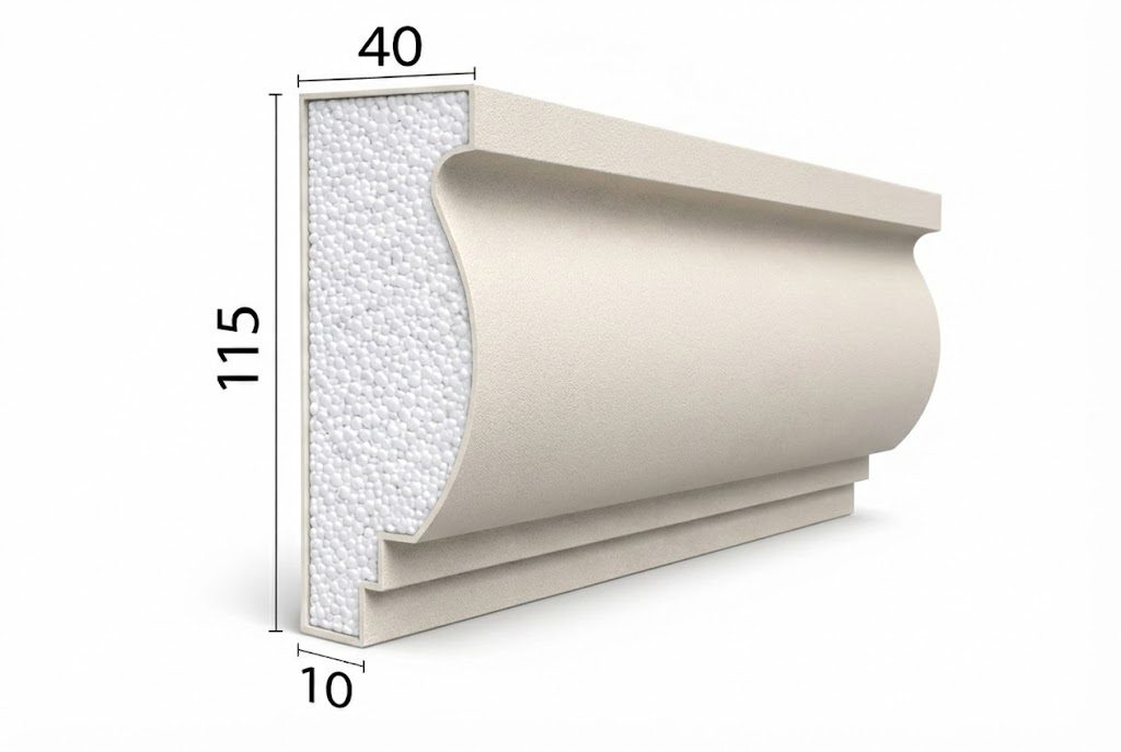 Profilul decorativ exterior BD-PD-10 este conceput în principal pentru realizarea ancadramentelor la ferestre și uși, oferind fațadei un contur clar și proporționat. Cu o înălțime de 115 mm și o adâncime maximă de 40 mm, acest profil creează un accent vizual echilibrat, potrivit atât pentru construcții moderne, cât și pentru proiecte clasice sau lucrări de renovare.