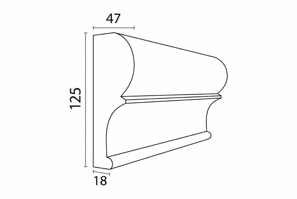 Profilul decorativ exterior BD-PD-09 este conceput pentru realizarea brâurilor decorative la soclul casei și pentru utilizare ca bază pentru colțare decorative, oferind o delimitare clară și proporționată a zonei inferioare a fațadei. Cu o înălțime de 125 mm și o adâncime maximă de 47 mm, acest profil creează un accent vizual bine definit și echilibrat.